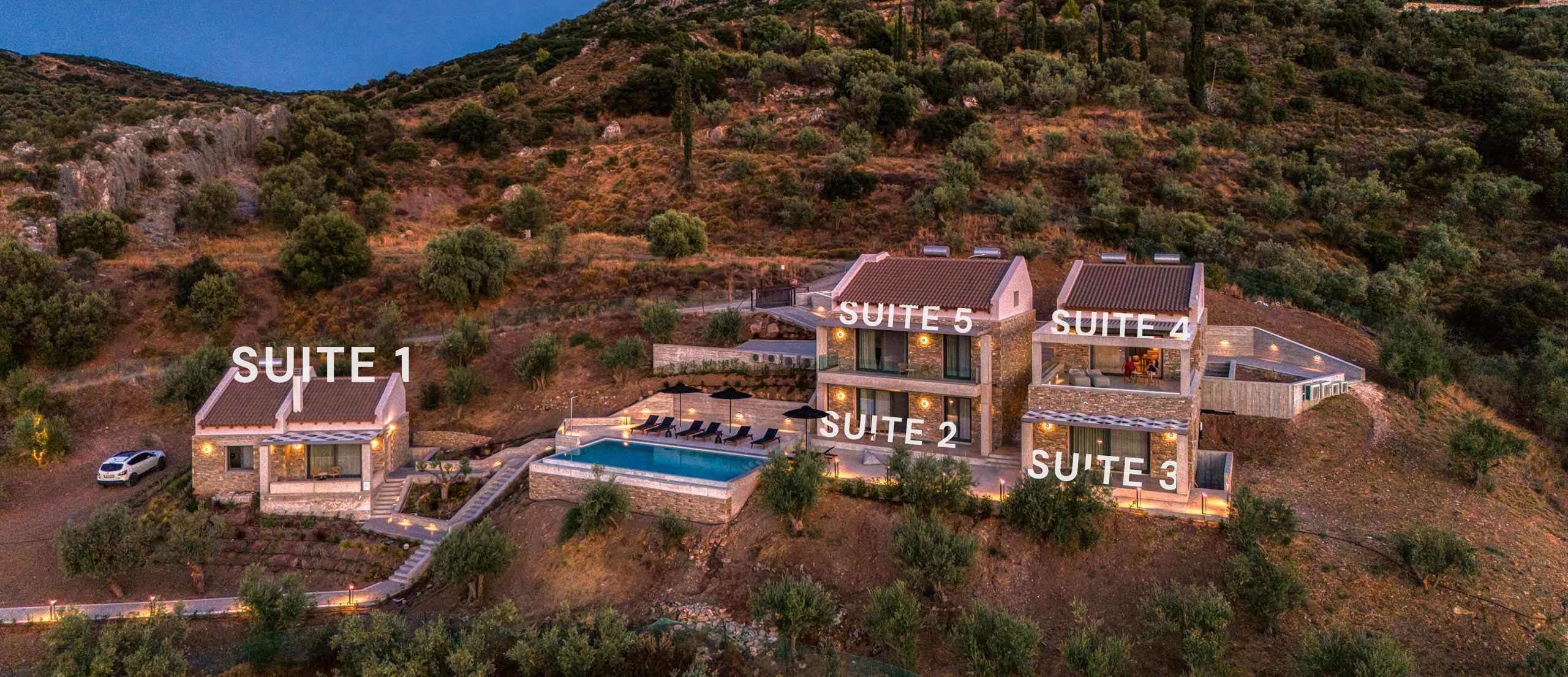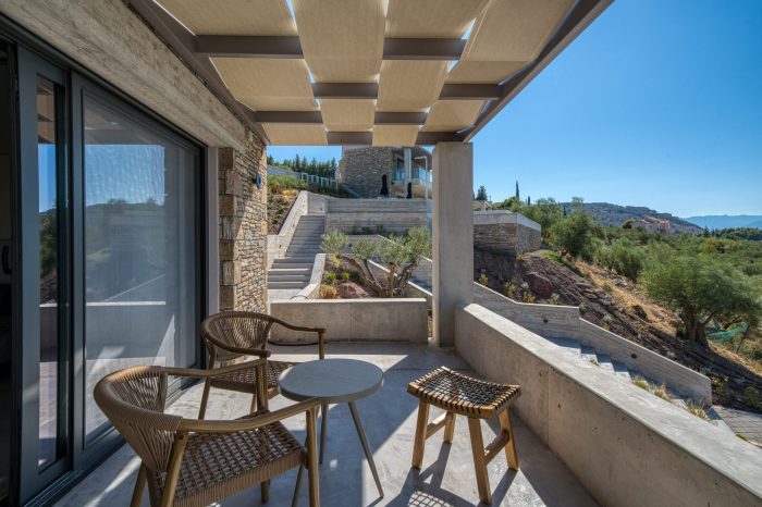 Minimalistic two-bedroom house with soft textures and views of olive groves – a soulful retreat made for shared, restful escapes.